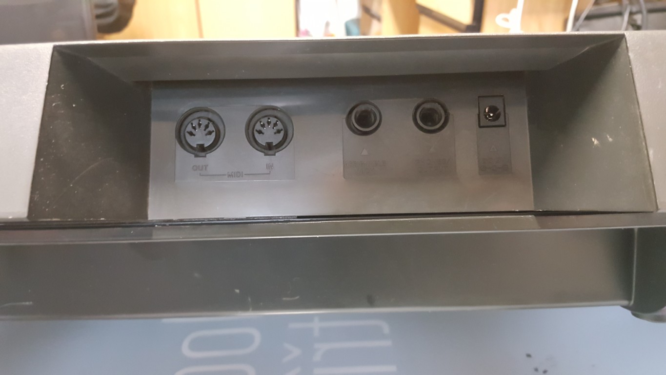 - Konektory: DC IN, LINE OUT (R/MONO, L), PHONES, MIDI (OUT, IN, THRU), HOLD (SUSTAIN PEDAL)